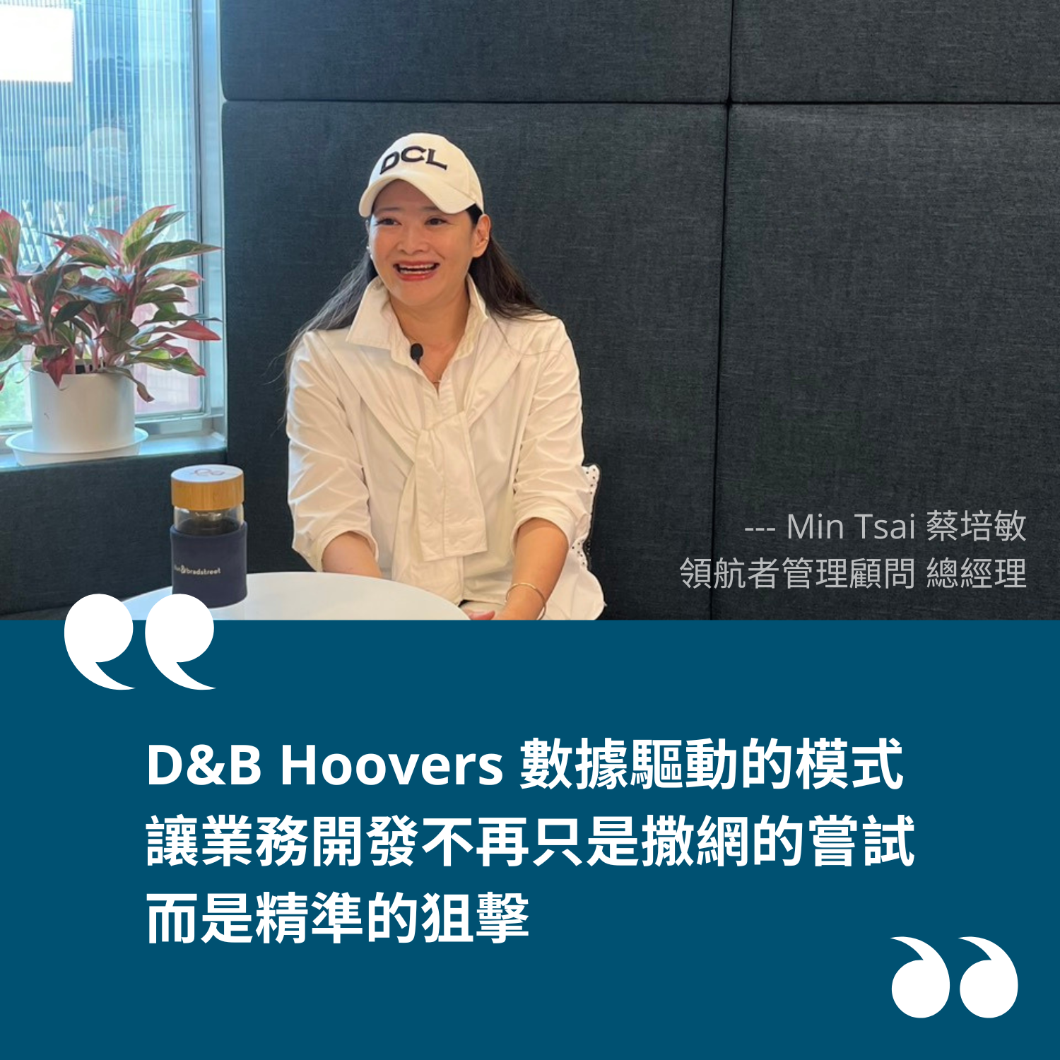 作為顧問輔導角色,領航者當然需要幫助客戶解決痛點。蔡培敏解釋,「我們掌握知識領域以及對產業的理解,除了幫客戶對接資源,更重要是成為橋樑,協助企業建立數據架構,在面對市場變化時,不再是被動等待而是主動引領。因此我們積極尋求可靠的數據工具,將數據轉化為具洞察力的策略,我們研究市面上工具後發現,『D&B Hoovers 全球銷售加速平台』不僅僅只是數據資料庫,更是能驅動客戶業務成長的策略引擎。」因而種下雙方後續合作的契機。