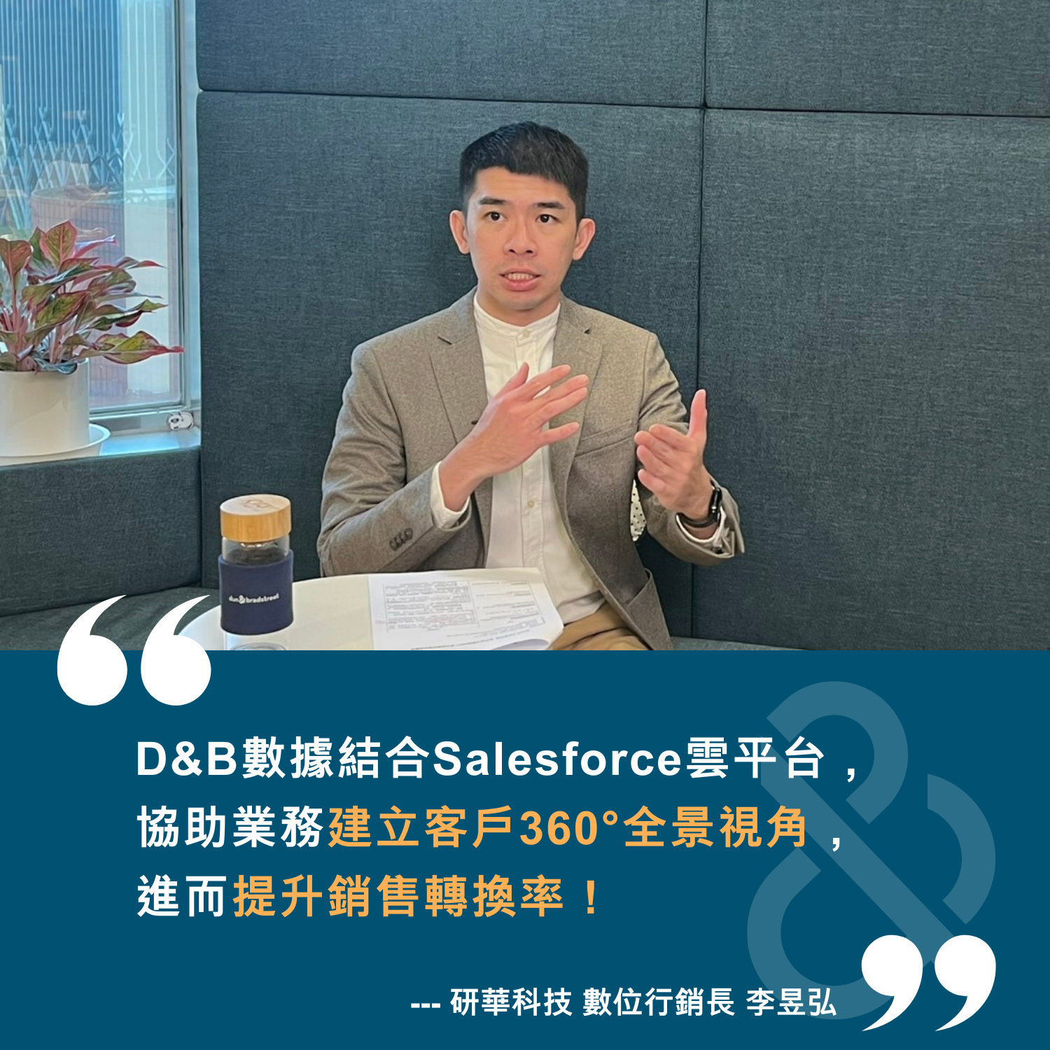 數位行銷長於訪談中也特別分享:「在還沒有使用 D&B DATA BLOCKS 之前,我們要外包人力手動搜尋公司資訊,或從公開會計年報逐筆去輸入企業客戶的規模、年營收、員工人數等重要資料;現在有鄧白氏的資料庫之後,不再需要手動輸入,而是仰賴系統整批匯入並結合我們 Salesforce 的數據,等於是協助業務建立起客戶的 360 全景視角,幫助他們在銷售前期做足準備,瞭解要開發的客戶是屬於 Key Account、Channel Partner、中小型顧客、過去的歷史成交訂單、銷售折扣的平均水平、信用記錄等,讓同仁依據業務目標及客戶需求來提升銷售轉換率,」。