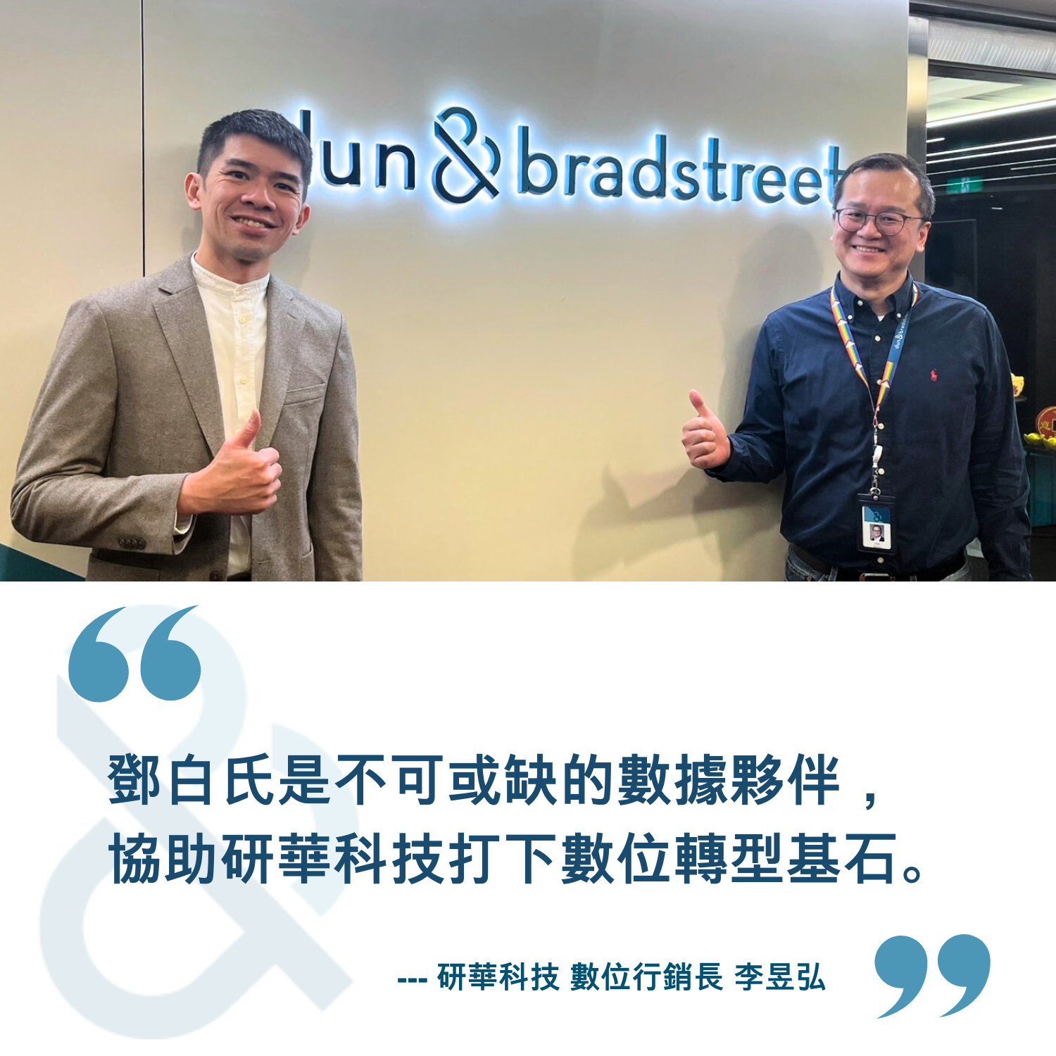 回顧多年來研華積極攜手鄧白氏,不斷累積數位轉型的里程碑,最後也想與正在數位轉型路途上奮鬥的企業分享,「想要及早實現您的數位願景,建議可以請鄧白氏團隊為自身資料狀態先進行完整的健康診斷與剖析,藉由專業經驗的顧問,迅速理解目前企業內資料的優劣勢,鄧白氏亦能從旁協助找出下一步關鍵行動,相信『小規模嘗試、大規模複製』的數位轉型之路不再是難事。」