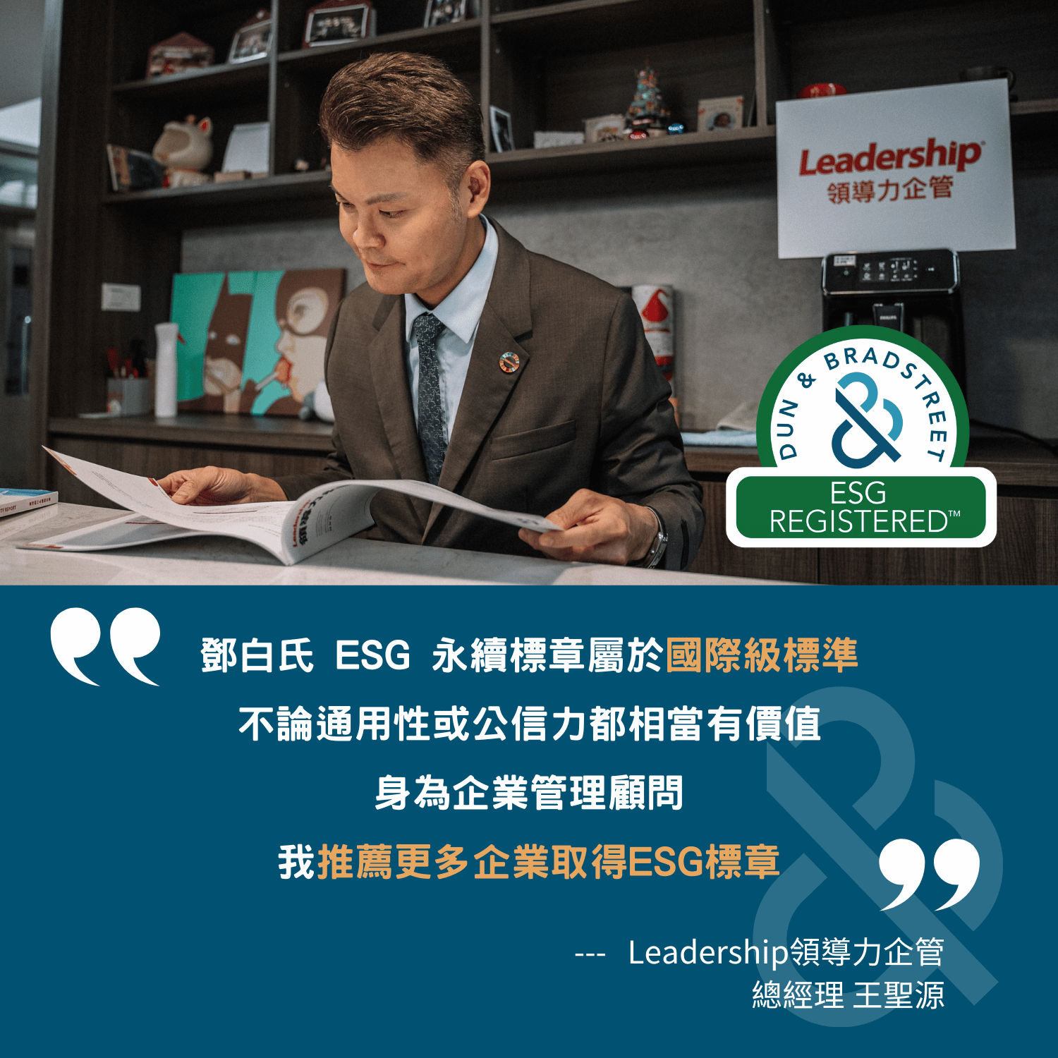 領導力企管總經理王聖源表示:「ESG 可以視為公司永續經營的最大願景,而底下支持的基石就是 ISO 標準!我們的優勢在於建立起 ISO、ESG 兩個部門且雙軌發展,提供專業、多元化的輔導服務,現在領導力企管在 ESG 顧問輔導的全台市占率位居第二、第三位。」
