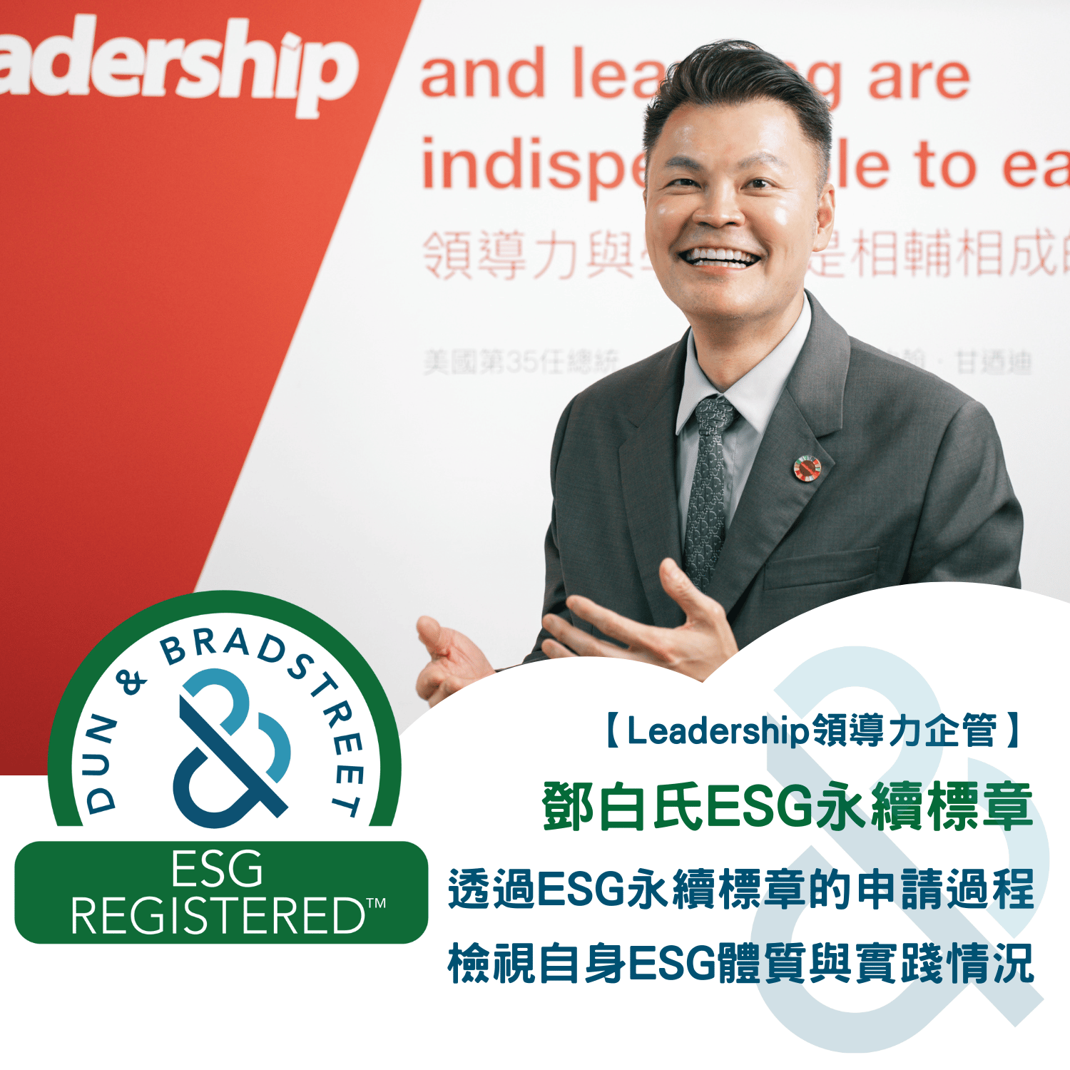 其次是領導力企管親力親為獲得鄧白氏 ESG 永續標章,深知企業在申請標章的準備過程,可能會遭遇哪些難題或挑戰。因此在做顧問輔導的時候,領導力企管也能提供對應的服務方案,一方面幫助企業客戶檢視自身永續策略並持續優化;另一方面也幫助更多國際化佈局的企業,最終取得鄧白氏 ESG 永續標章,接軌國際合規標準,順利拓展外銷生意。