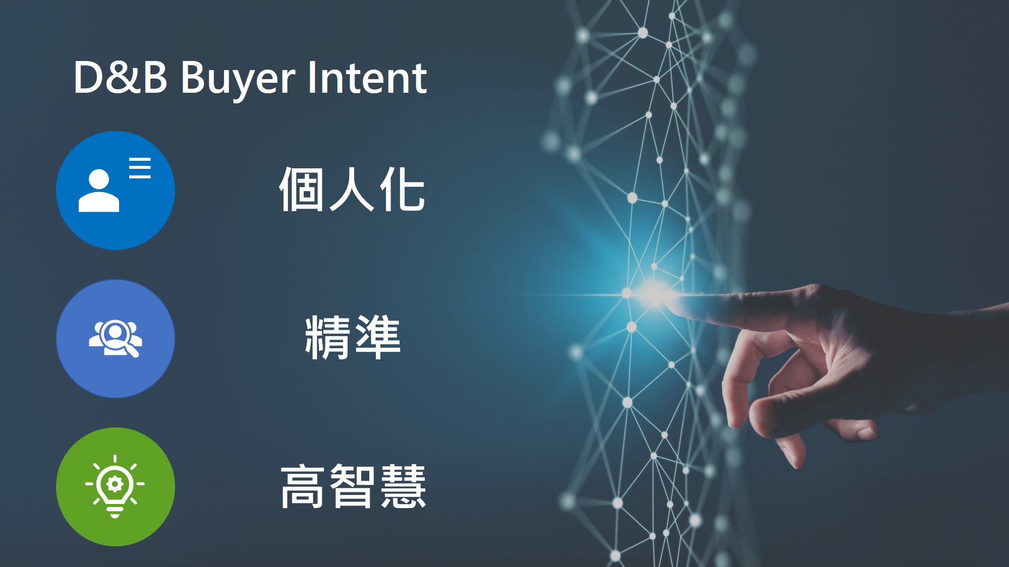 D&B Buyer Intent 的數據使用自然語言處理(NLP)、深度學習及將數十億網路活動映射到D&B Data Cloud 等技術的專利流程是尋找市場內買家的最精萃解決方案。可讓組織發覺市場內早早發出採購訊號的潛在客戶,以提高他們跨入市場策略的及時性、相關性和影響力。