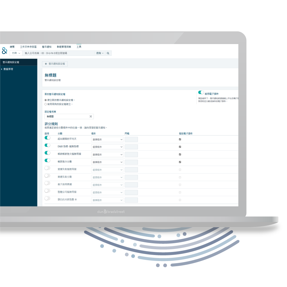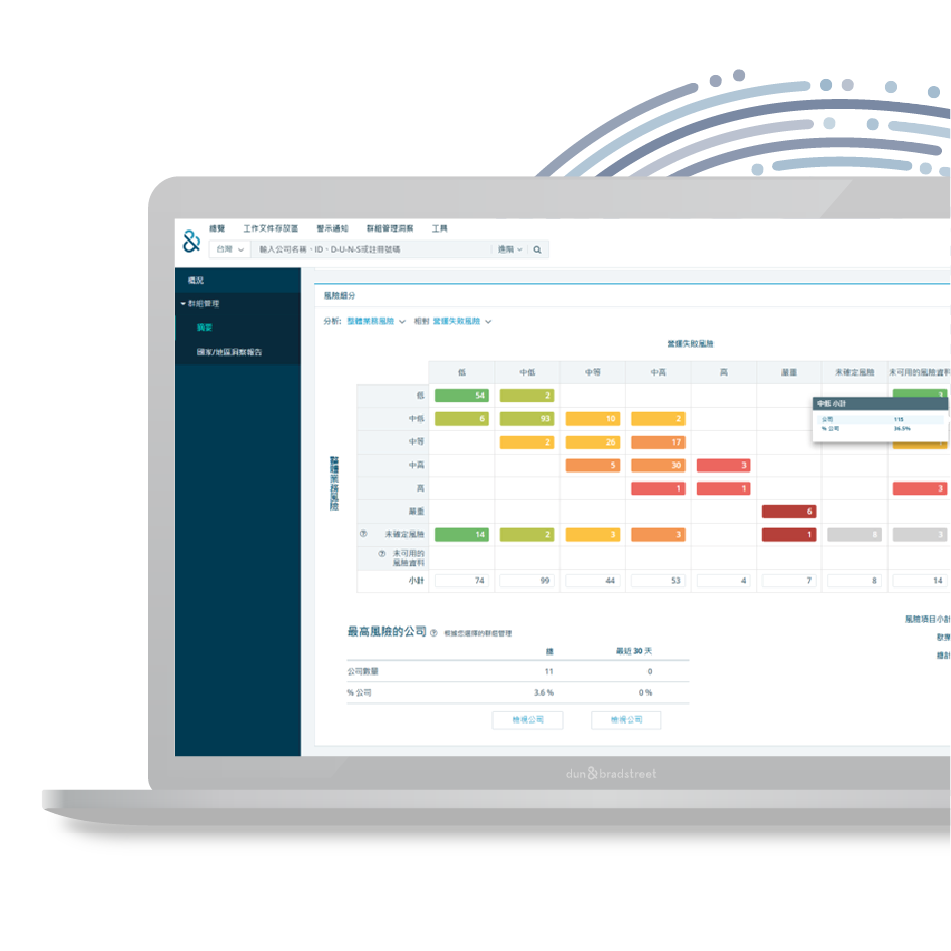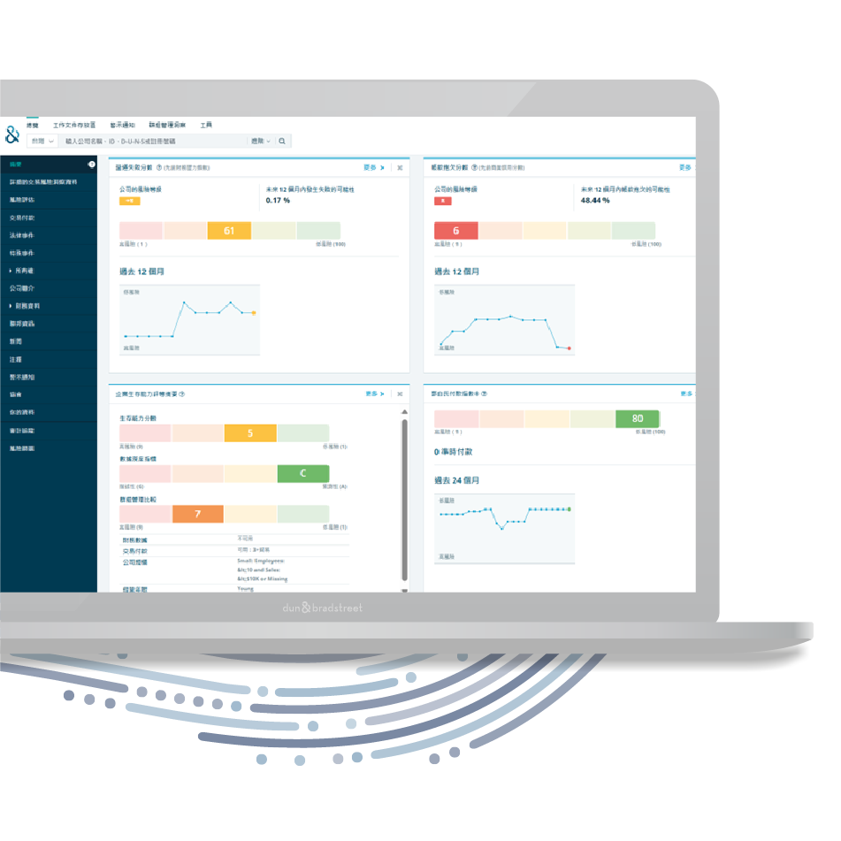 透過 D&B 全球數據為基礎,計算企業的鄧白氏 D&B Rating 與 Failure Score 企業失敗分數,讓您用全球一致的信用標準檢視客戶的財務風險