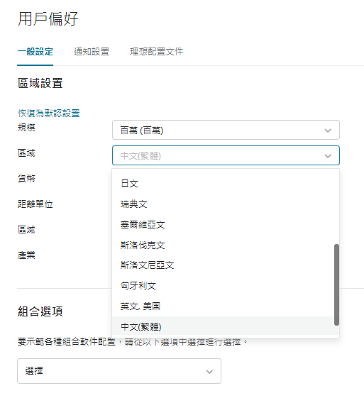 用戶可以通過點擊右上角用戶 ICON 下拉清單中的“User Preferences使用者首選項”進入使用者偏好設置頁面,在“Locale 區域”選項下拉清單中選擇偏好語言。
