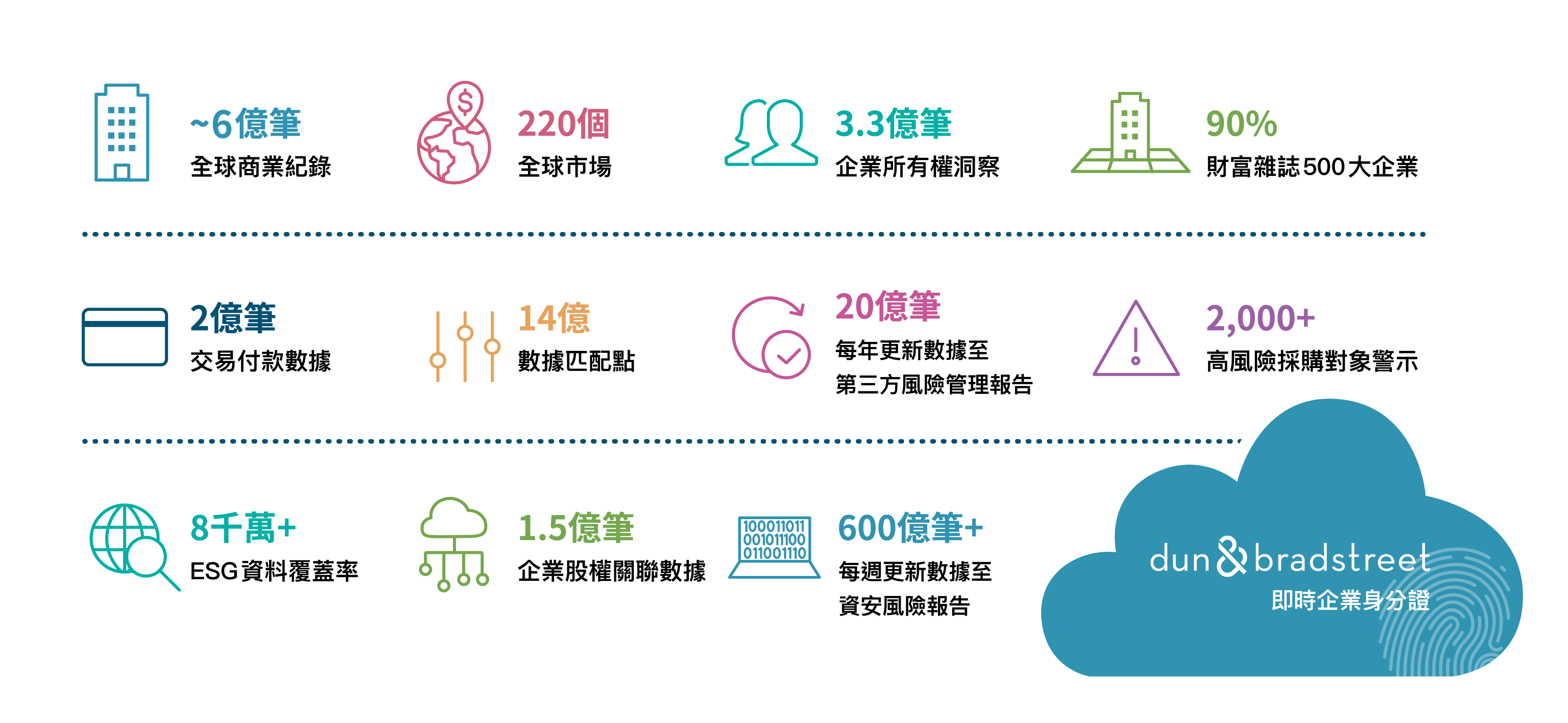 D&B合規管理平台提供統一的管理介面,整合多方真實企業數據源,協助您能快速驗證和辨識潛在客戶、商業夥伴和第三方企業,其中 D&B 企業數據包括: