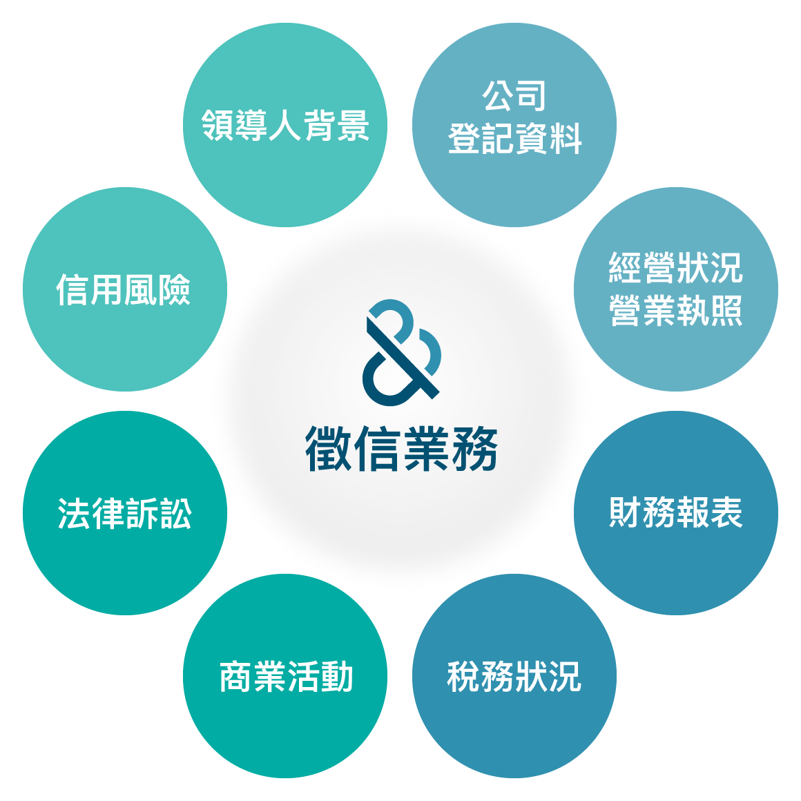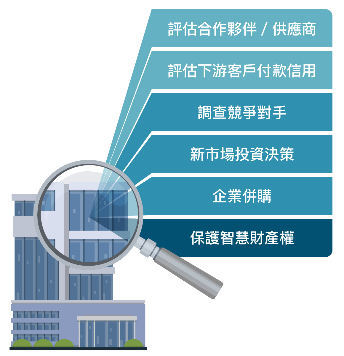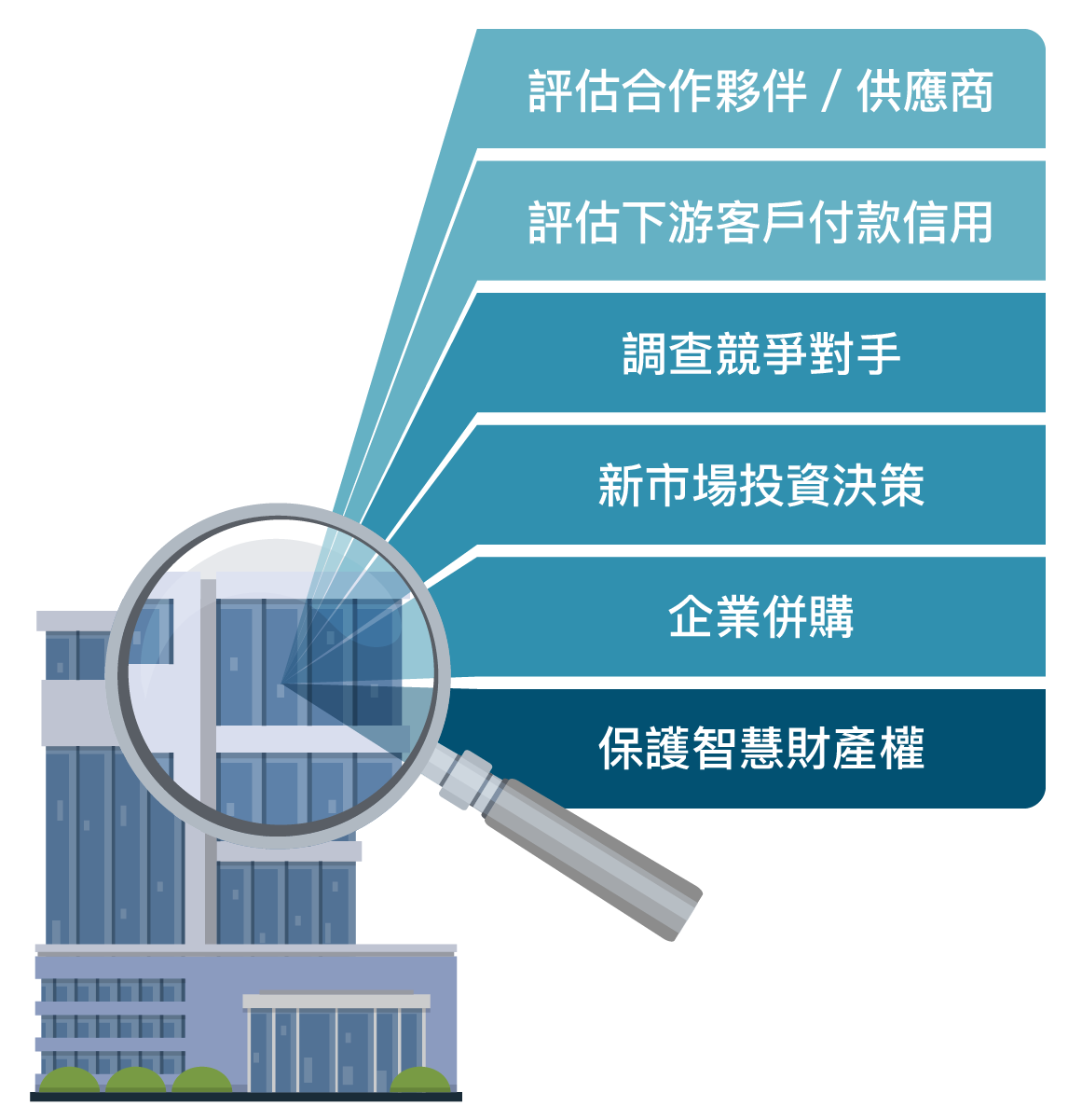 幫助投資人或合作客戶了解一家企業的信用狀況,包含業務範圍、股東背景、財務狀況、管理/生產能力、市場佔有率、信用風險等營運狀況,確保商業活動具合法性、合規性。