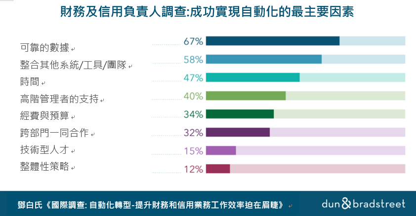 鄧白氏財務解決方案總經理Andrew Hausman表示:“可靠而全面的資料是成功實現自動化的核心。在分析和洞察的推動下,自動化不僅可以降低營運成本和提高效率,而且有助於整個公司開闢新的增長途徑。”