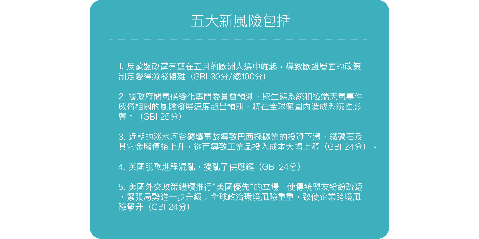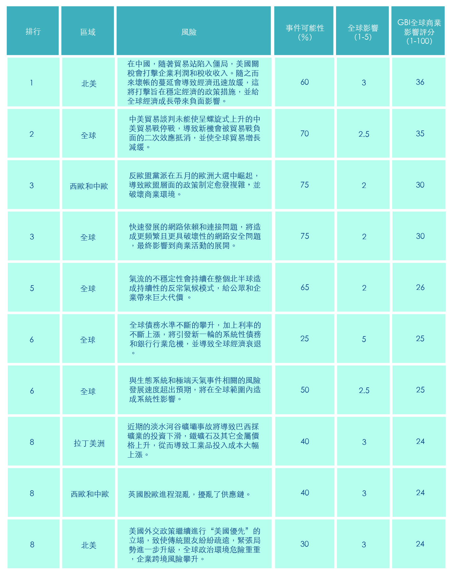 本期鄧白氏2019年第一季的全球商業影響評分顯示,企業面臨的風險已經連續4個季度惡化,創下了歷史第二高位,而歷史最高發生在2018年第一季。2019年第一季的得分突顯出,如無意外,儘管全球經濟正在從2008-2009年的衰退中復甦,企業決策者仍需在全球經濟放緩之前持續、謹慎地關注全球商業環境。同時,與貿易戰、政治、經濟發展、新技術以及氣候變化相關的風險,在地域上呈現出分散化和多樣化的特點,這將導致商業環境越來越具有挑戰性。