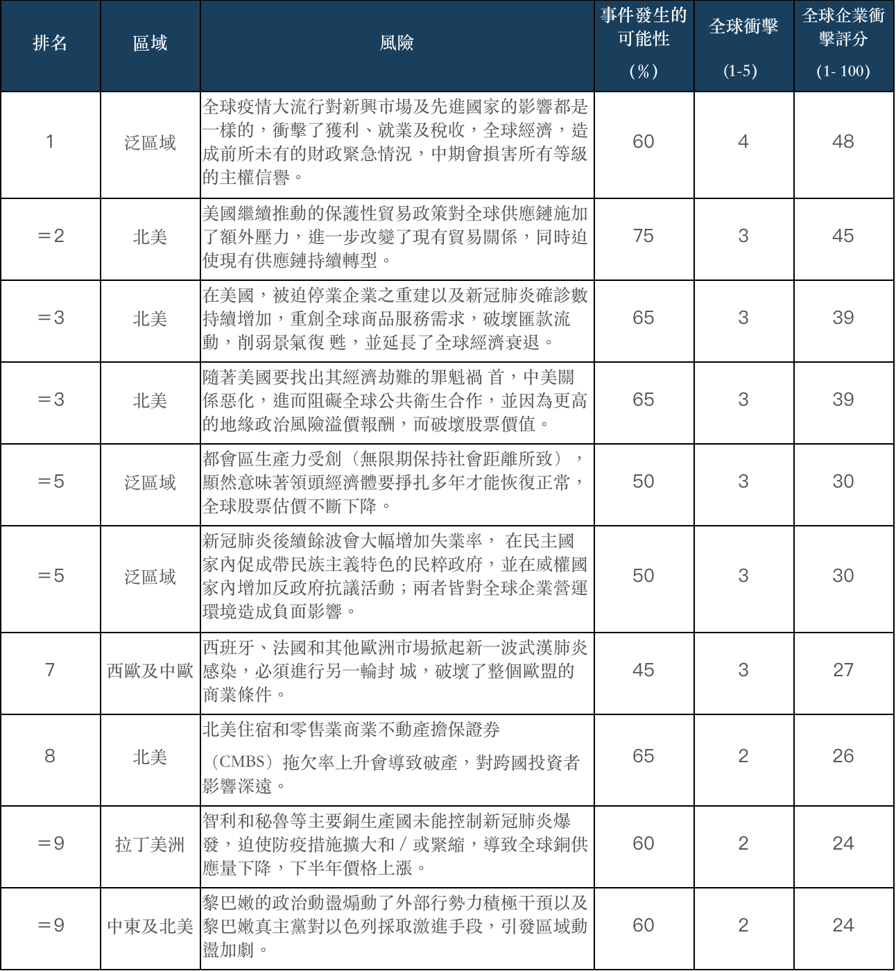 最後一項風險為西班牙、法國和其他歐洲市場掀起新一波武漢肺炎感染,必須進行另一輪封城,破壞了整個歐盟的商業條件。此一新風險排名第七,GBI分數為27。