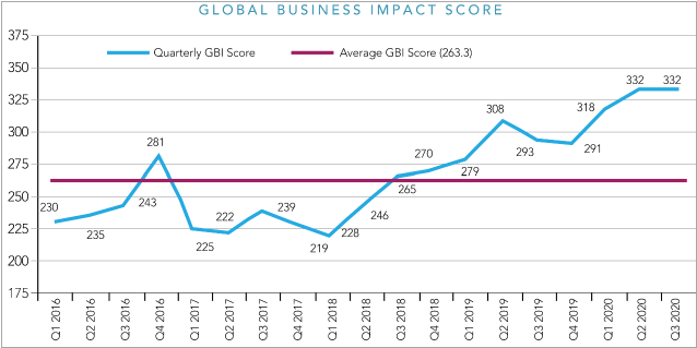 2020年第三季鄧白氏全球企業衝擊分數報告顯示,企業面臨的風險仍處於破紀錄的高點。