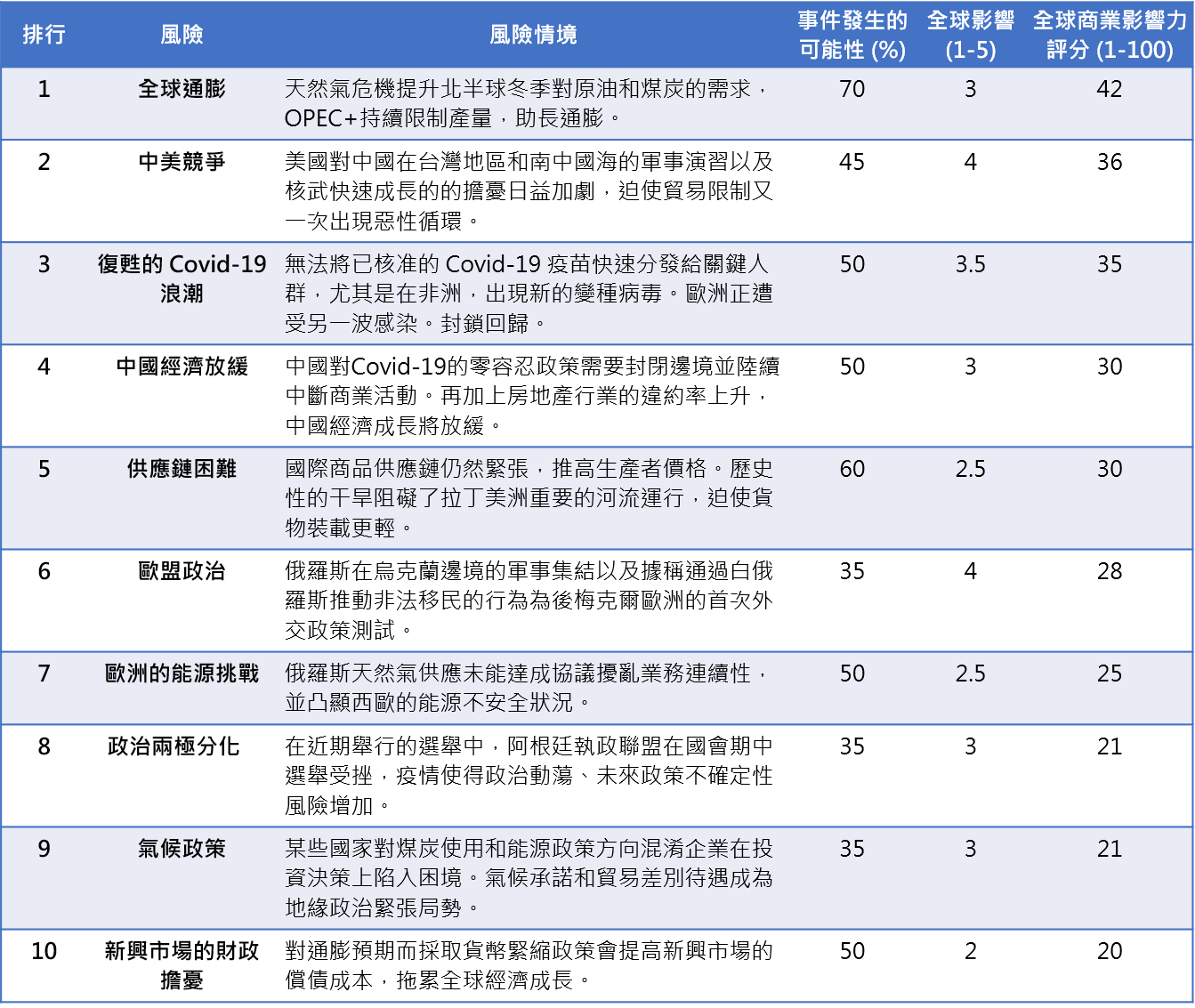 Covid-19出現兩年後,企業仍在努力恢復正常營運,但仍存在重大不確定性,包括捲土重來的風險、致命的變種、違約和破產率上升、政治變化…等。在我們的十項風險清單中,有三個風險和疫情相關。