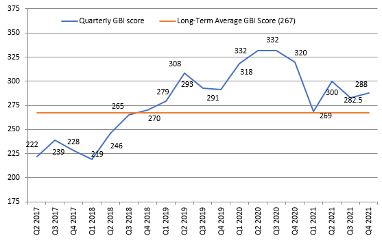 鄧白氏GBI風險評分從2021年第3季的 282.5 小幅上升至第4季 288(圖一),但仍低於2020年第2季和第3季近期高點332。儘管GBI風險評分低於整個2020年的水平,但仍高於長期平均值267.6;顯示企業跨境經營持續面臨高度挑戰。