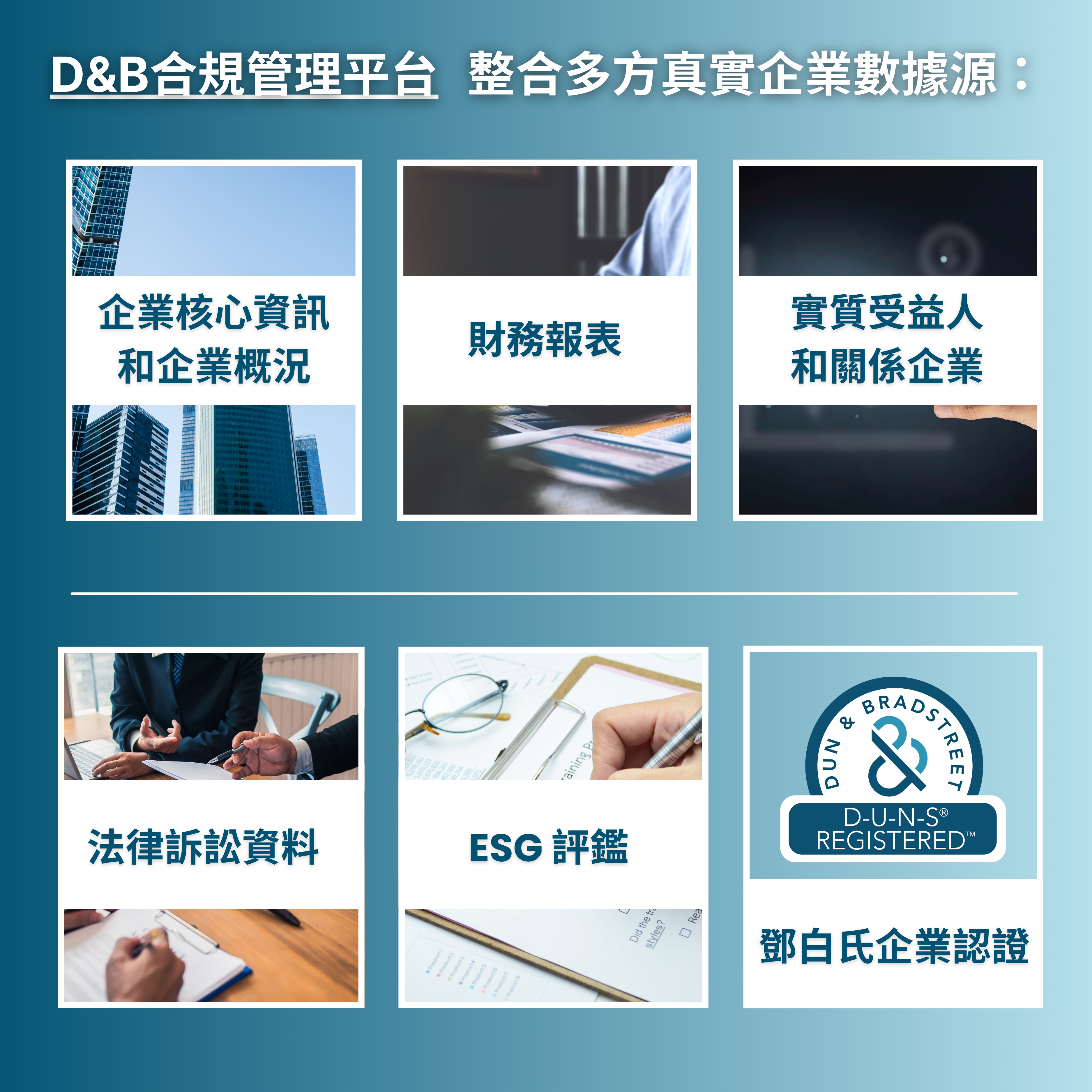為了減少識別實質受益人的挑戰,企業可以強化的輔助方法,包含結合多項資訊來源進行交叉核實、提供員工識別過程的明確流程指引、以及搭配第三方工具,來提升實質受益人識別的效率和準確度。例如D&B合規管理平台除了具備自動化且不間斷的KYC/KYB 盡職調查與監控管理流程特色之外,更重要是該平台整合多方真實企業數據源,包含: