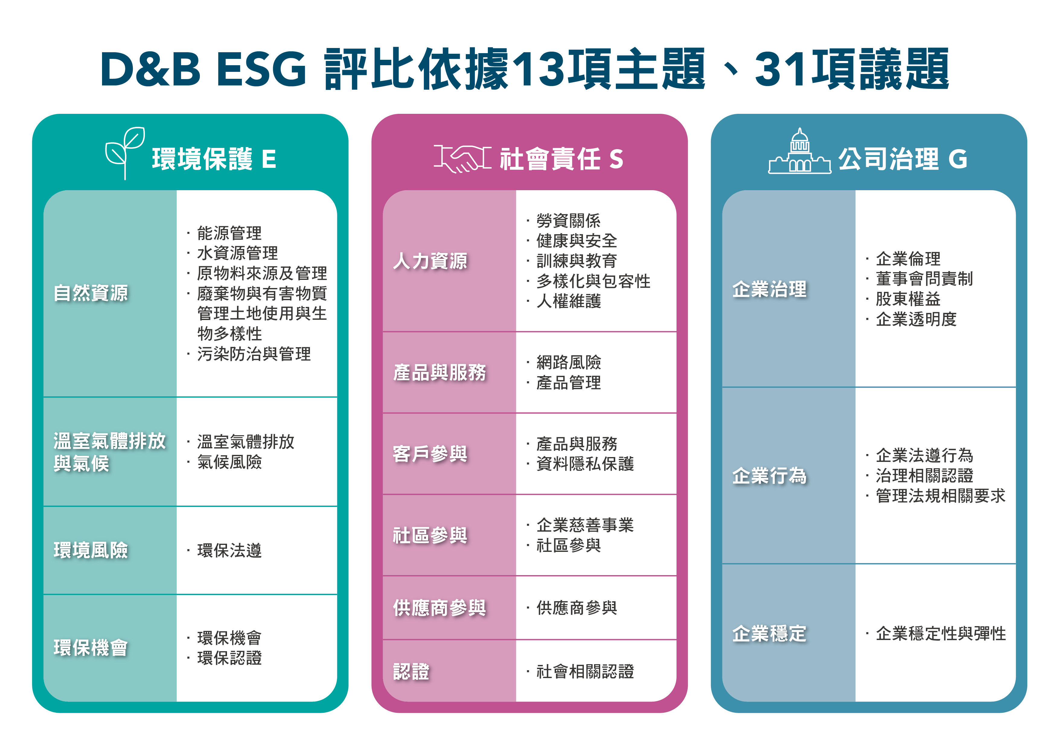 鄧白氏國際首席運營官Julian Prower表示,鄧白氏提供一致的ESG評比標準,幫助企業落實國際六大永續準則,包括:CDP、SASB、GRI、UN SDGs、TCFD、UN PRI等架構,協助企業兼顧短期收益與長期競爭力。鄧白氏的全球商業數據庫資料來源涵蓋公開與非公開發行公司、歷史資料、新聞資訊、新型態的另類數據(Alternative Data),結合豐富的數據建模能力(Analytics)與AI模組分析技術,打造出全球一致的ESG評比標準,依據13項主題,31項議題在環境保護(E)、社會責任(S)、公司治理(G),綜合計算而成,根據產業別各有不同的權重,最後以ESG分數來量化風險程度,以1分為表現優秀,5分為表現落後,讓企業一目了然其ESG現況,進而擬定符合永續發展的改善計畫。