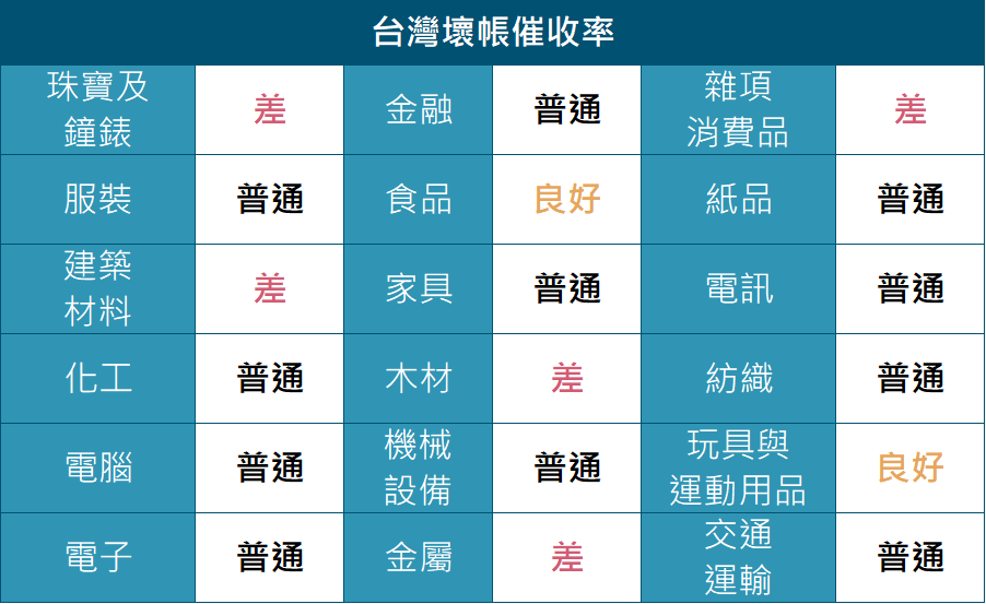 在全球在建築材料、家具與交通運輸行業,壞帳催收率屬於高危險級別的。
