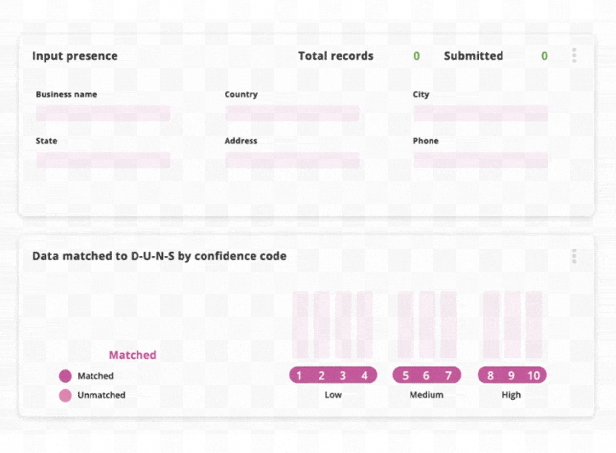 •    創造並儲存匹配規則以供將來使用,例如匹配質量門檻,根據D&B Confidence Code (匹配度評分)、匹配字符/字串等級以及需要返回的候選匹配數量等