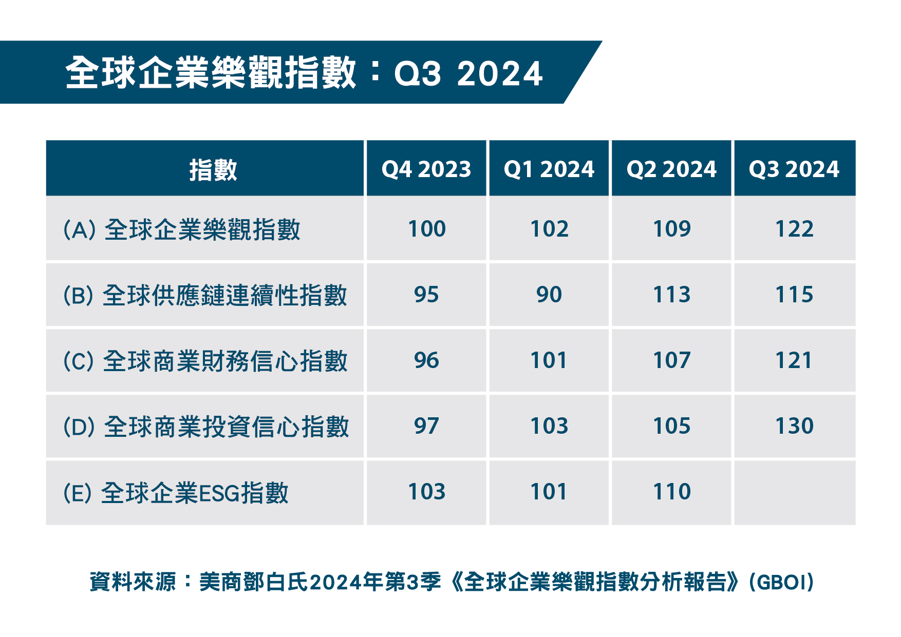 每季更新的美商鄧白氏《全球企業樂觀指數分析報告》(GBOI),目的在衡量全球企業的樂觀程度,並提供獨特且全面的見解,探討商業領袖們對增長、營運和投資預期及展望背後的想法。美商鄧白氏《全球企業樂觀指數分析報告》(GBOI),由五個客觀量化指數組成:(A)全球企業樂觀指數、(B)全球商業供應鏈連續性指數、(C)全球企業財務信心指數、(D)全球商業投資信心指數、(E)全球企業ESG指數。前四個指數反映了下一季的商業預期,而ESG指數反映了本季對關鍵ESG屬性的看法。美商鄧白氏《全球企業樂觀指數分析報告》(GBOI),針對32個經濟體、17個產業和大中小等三種企業規模,對全球約10,000家企業進行調查,搭配鄧白氏專有的數據和經濟專業知識進行補充。有鑑於GBOI報告發行已歷經一年,累積一定的資料深度,故深化指數設計,並調整指數計算方法,以Q3 2023至Q2 2024為基期進行標準化計算。當分數高於100時,代表正向樂觀;而分數低於100 時,則代表趨向保守樂觀。