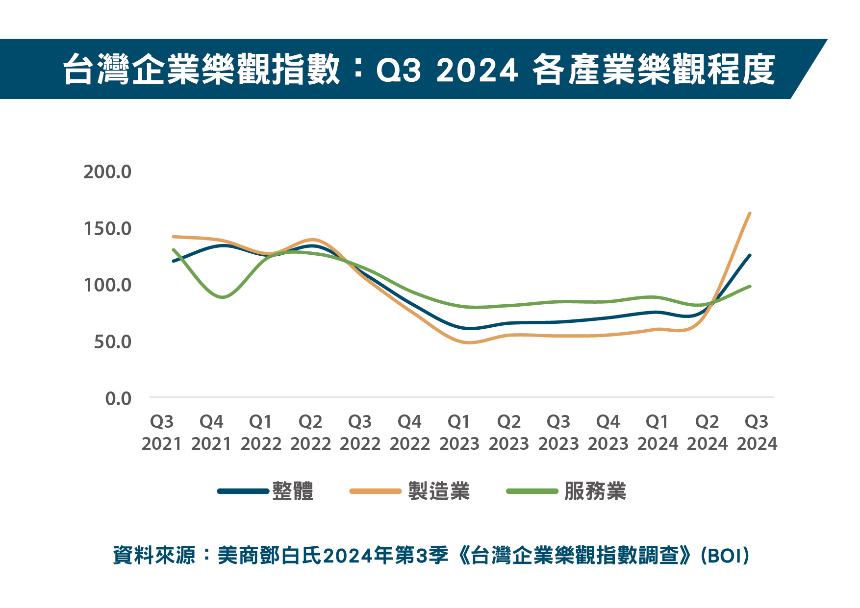 與2024年第二季相比,大型企業推動了2024年第三季度的樂觀指數增長(+130%),其次是中型企業(+51%),小型企業(+37%)。繼2024年第二季下降後,大型和小型企業的樂觀指數在第三季有所改善,該數據顯示,在AI人工智慧和半導體相關產品的高出口需求和强勁的内部消費需求的帶動下,企業對台灣地區的經濟成長前景持樂觀態度。